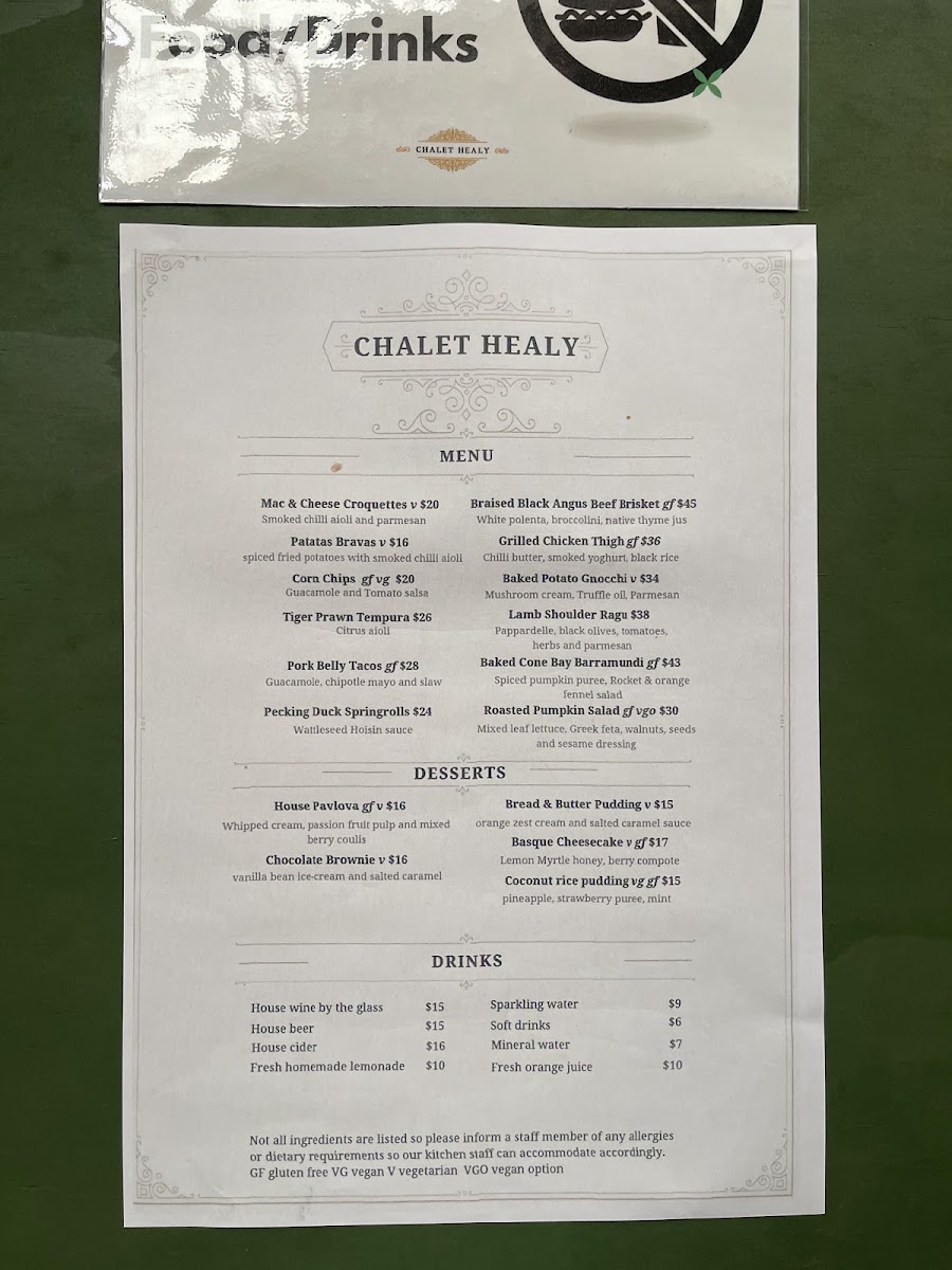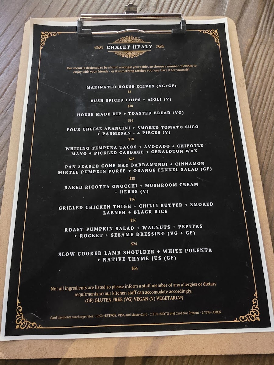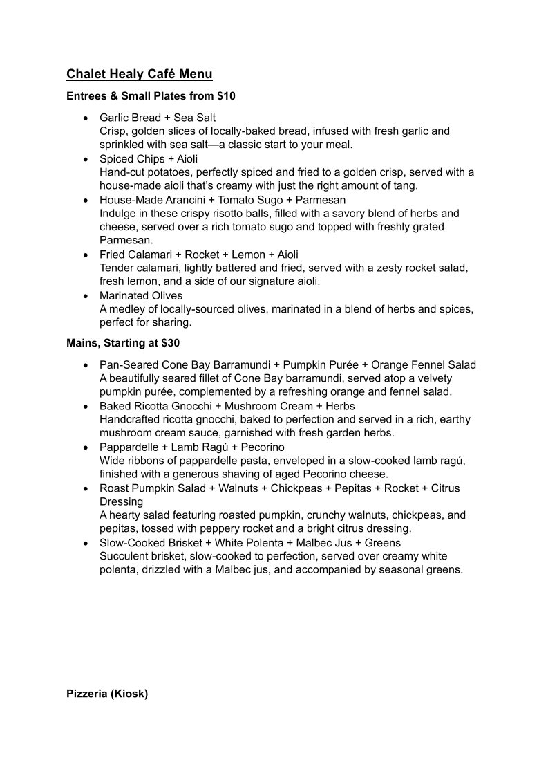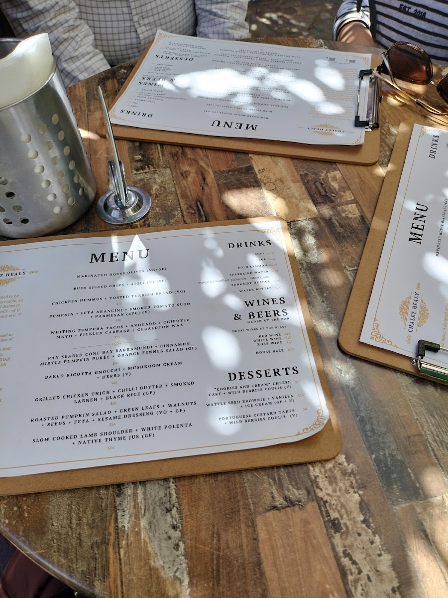 As a concluding impression, the menu at Chalet Healy Restaurant Cafe reflects a thoughtful balance between modern Australian cuisine and comforting café classics, all crafted with a clear respect for fresh, high-quality ingredients. From the restaurant menu, dishes like Whitting Tempura Tacos stand out for their vibrant mix of avocado, chipotle mayo, pickled cabbage, and native Geraldton wax, while the Pan-Seared Cone Bay Barramundi impresses with its refined pairing of cinnamon myrtle pumpkin purée and orange fennel salad, offering a gluten-free option without compromise. Comfort and indulgence come through in the Baked Ricotta Gnocchi with mushroom cream and herbs, as well as the Grilled Chicken Thigh served with chilli butter and smoked labneh. Lighter, plant-forward choices such as the Roast Pumpkin Salad with walnuts, pepitas, rocket, and sesame dressing ensure the menu remains inclusive for vegan and gluten-free diners.