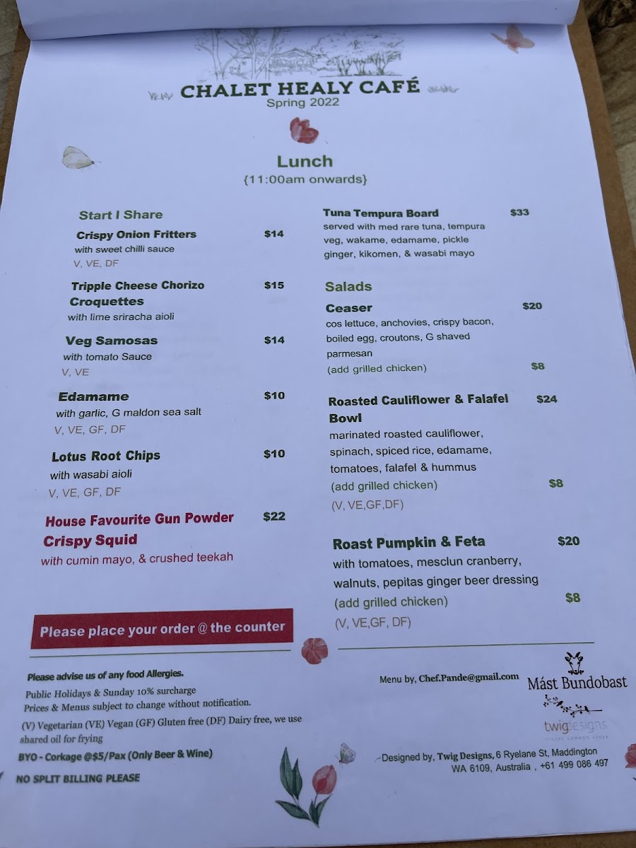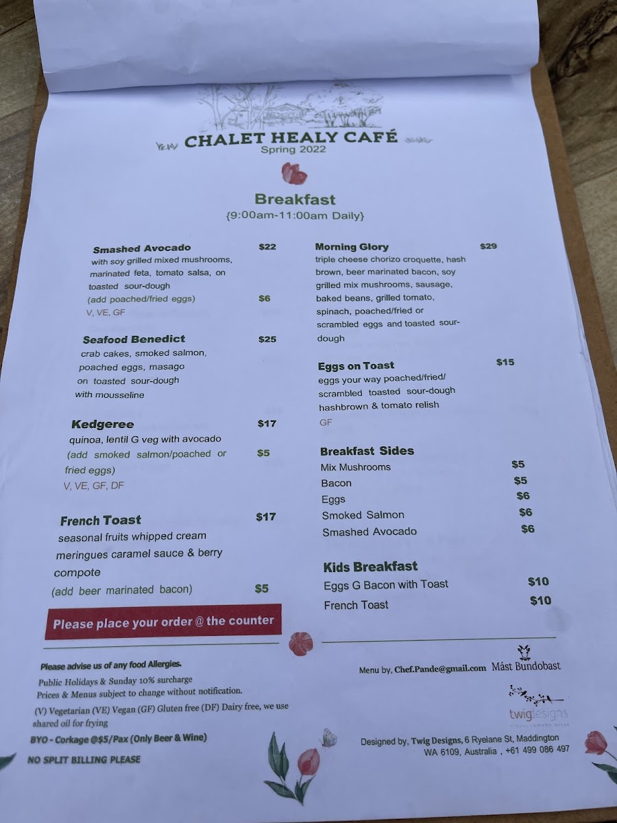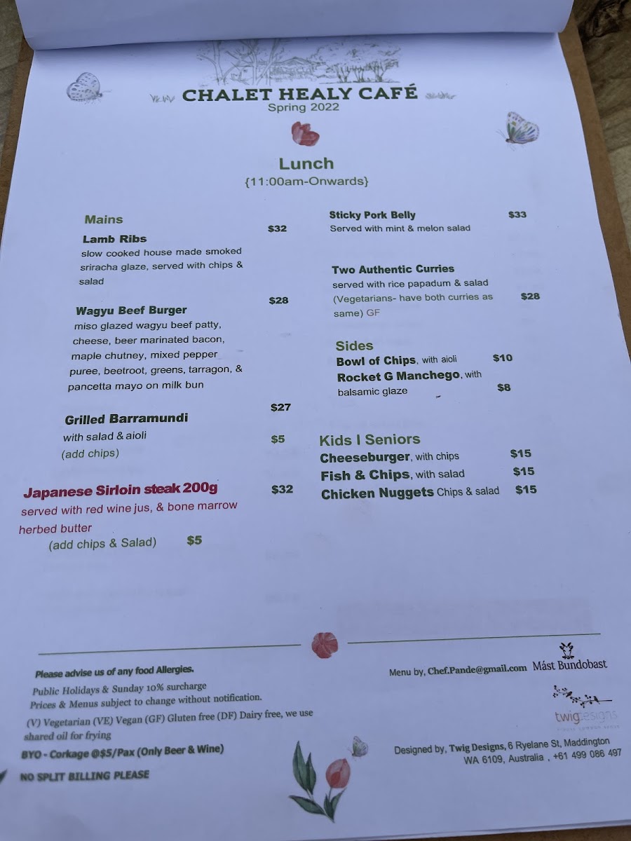 As a concluding impression, the menu at Chalet Healy Restaurant Cafe reflects a thoughtful balance between modern Australian cuisine and comforting café classics, all crafted with a clear respect for fresh, high-quality ingredients. From the restaurant menu, dishes like Whitting Tempura Tacos stand out for their vibrant mix of avocado, chipotle mayo, pickled cabbage, and native Geraldton wax, while the Pan-Seared Cone Bay Barramundi impresses with its refined pairing of cinnamon myrtle pumpkin purée and orange fennel salad, offering a gluten-free option without compromise. Comfort and indulgence come through in the Baked Ricotta Gnocchi with mushroom cream and herbs, as well as the Grilled Chicken Thigh served with chilli butter and smoked labneh. Lighter, plant-forward choices such as the Roast Pumpkin Salad with walnuts, pepitas, rocket, and sesame dressing ensure the menu remains inclusive for vegan and gluten-free diners.