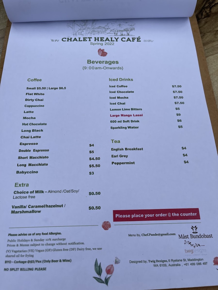 Small | Medium • Long Black - $5.00 | $5.50 • Flat White - $5.50 | $6.50 • Latte - $5.50 | $6.50 • Cappuccino - $5.50 | $6.50 • Mocha - $5.50 | $6.50 • Chai Latte - $5.50 | $6.50 • Espresso - $3.50 Hot Chocolate $6.00 | $7.00